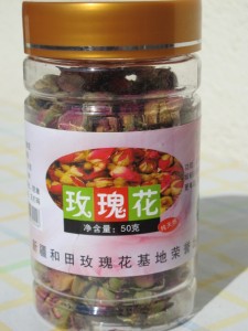 Eine Freundin in Shanghai drückte mir ein Schraubglas getrockneter Rosenblüten in die Hand. „Etwas ganz Besonderes“, sagte sie. „Rosenblütentee! Das Mittel der Frauen.“